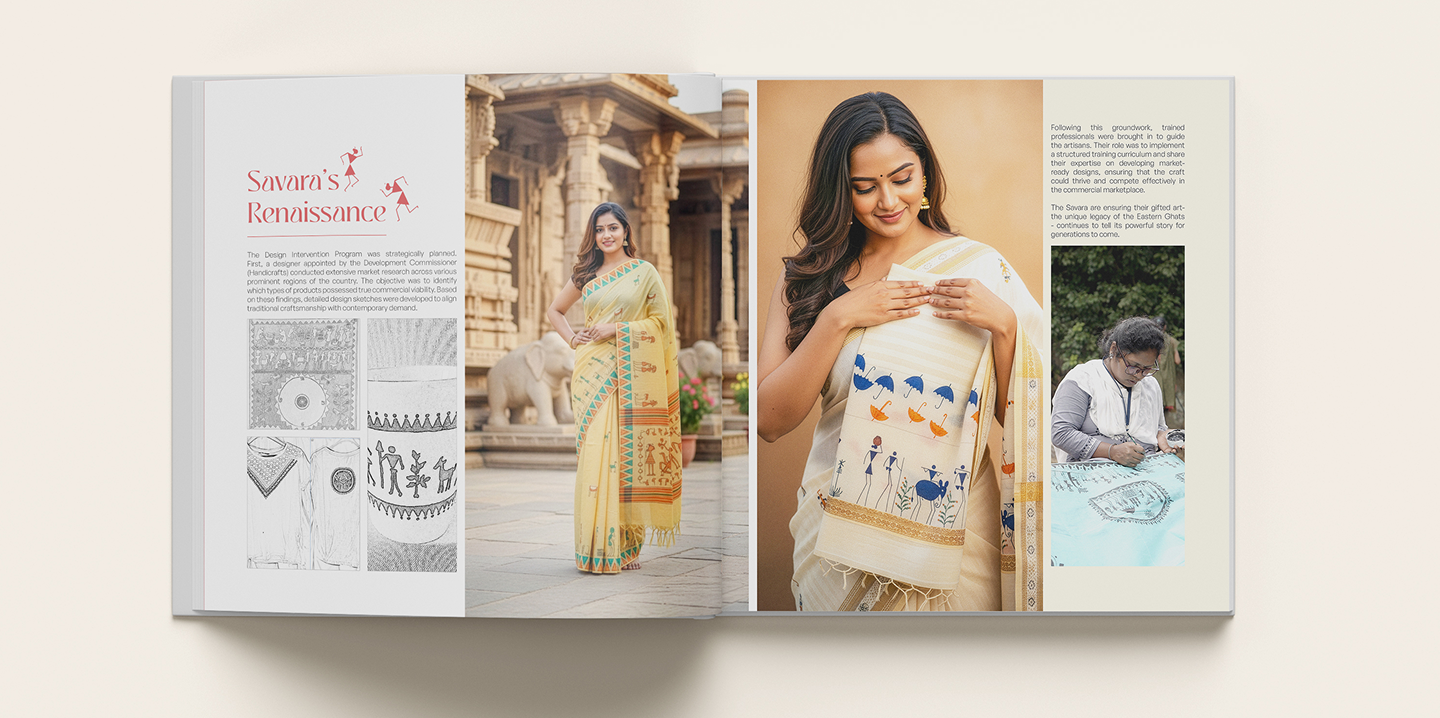 Rather than just documenting, Savara Renaissance interprets the cultural spirit of the Savara tribal community through visual storytelling — blending indigenous motifs with contemporary book design. The project goes beyond presenting artefacts; it curates a lived cultural experience by integrating imagery, typographic rhythm, and editorial structure that evoke the community’s ethos. In doing so, it positions tribal heritage as not only a subject of appreciation but as an active participant in design discourse, honoring tradition while making it accessible and engaging to a wider audience.